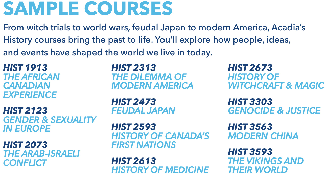History doesn’t just tell us where we’ve been, it helps us imagine where we’re going. At Acadia, you’ll study the forces, ideas, and people that have shaped our world, from ancient civilizations to the challenges of the modern era. Along the way, you’ll learn to think critically, write persuasively, and recognize patterns and perspectives that make sense of today’s global issues. You’ll build skills in research, writing, and analysis, but also in empathy, curiosity, and creative problem-solving.