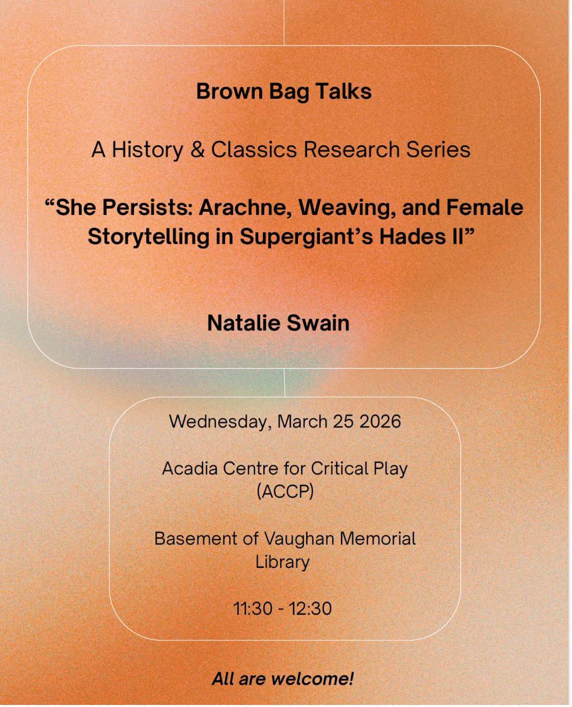 Our final Brown Bag Research Talk of the year approaches! On Wednesday, March 25th, 11:30 -12:30 Natalie will present a talk titled "She Persists: Arachne, Weaving, and Female Storytelling in Supergiant's Hades II". NOTE: the talk will take place in the Acadia Centre for Critical Play (ACCP), located in the basement of the Vaughn Library.